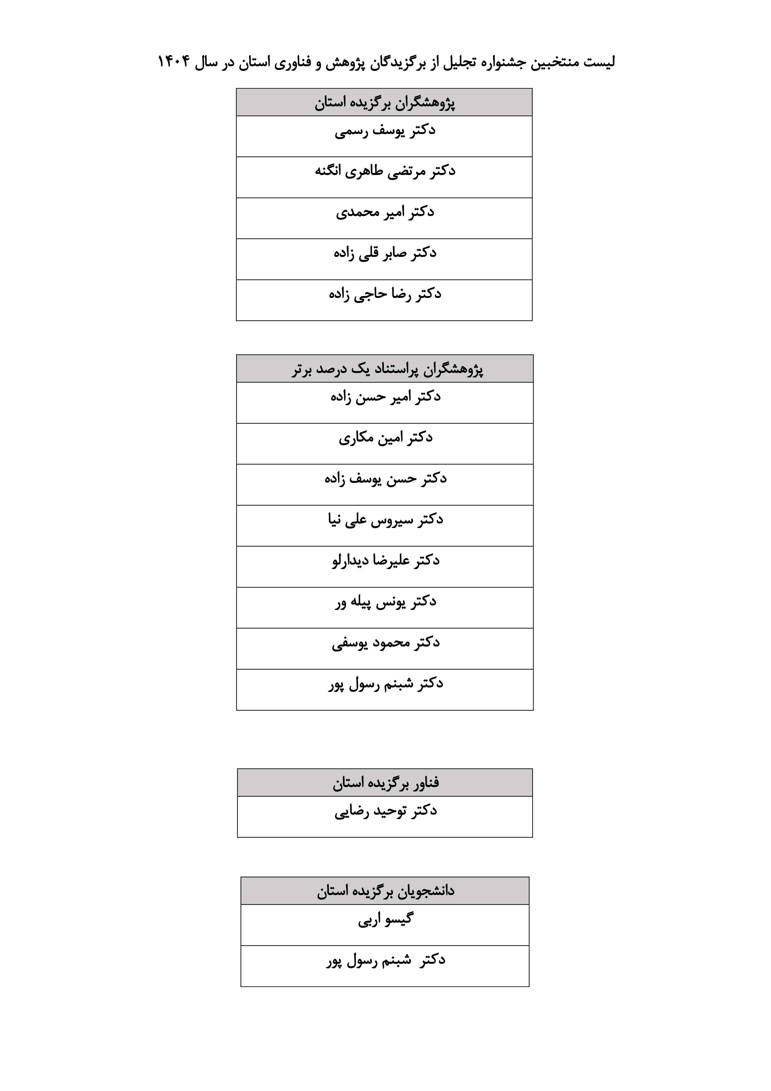 جشنواره تجلیل از برگزیدگان پژوهش و فناوری استان در سال ۱۴۰۴، روز یکشنبه ۱۶ آذر با حضور مسئولان استانی، مدیران واحدهای علمی و پژوهشی و جمعی از پژوهشگران برجسته برگزار شد. در این مراسم از پژوهشگران و فناوران برتر استان که در حوزه‌های مختلف علمی نقش مؤثری ایفا کرده‌اند، تقدیر به‌عمل آمد.