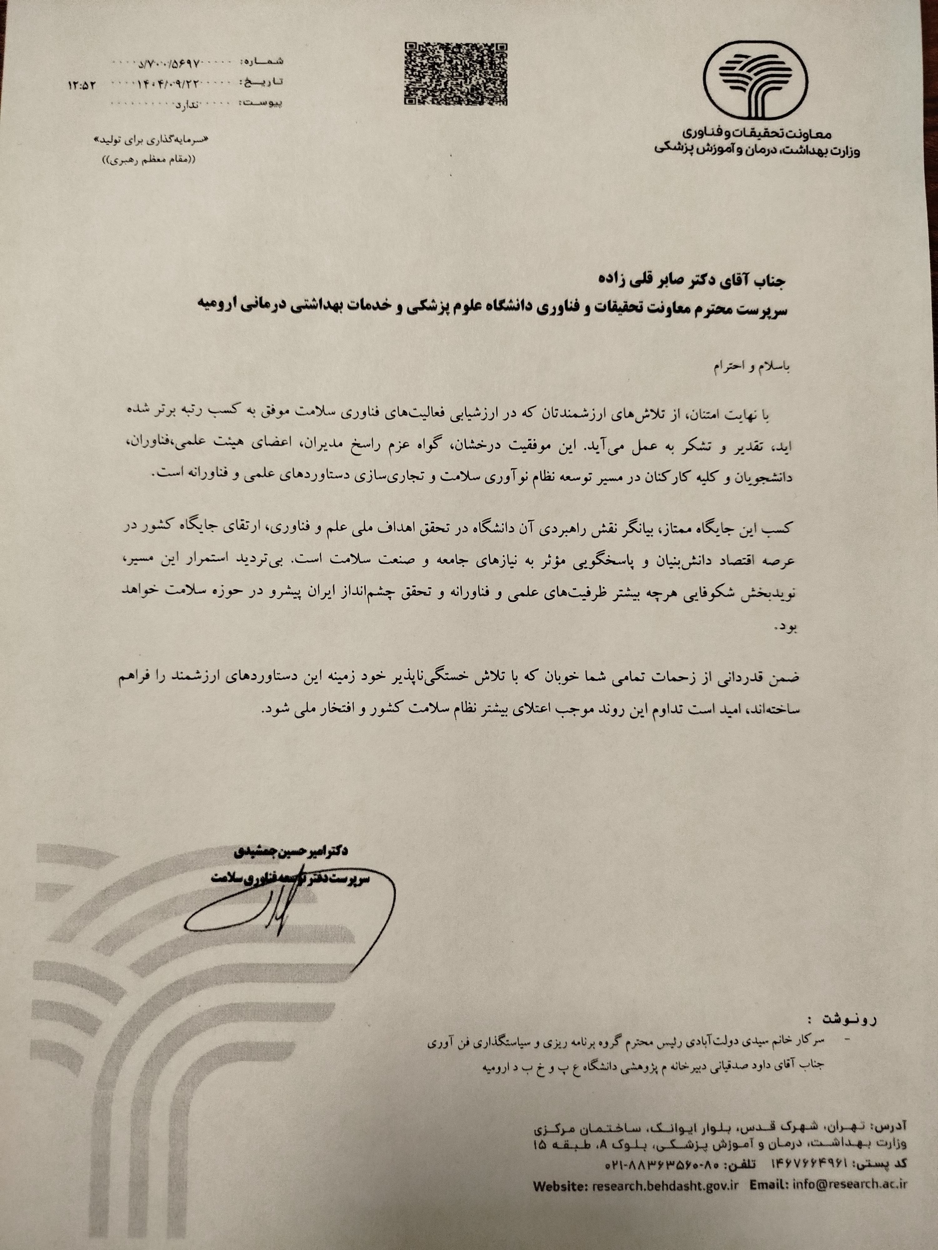 معاونت تحقیقات و فناوری وزارت بهداشت، درمان و آموزش پزشکی با صدور نامه‌ای رسمی، از عملکرد شایسته دانشگاه علوم پزشکی و خدمات بهداشتی درمانی ارومیه در ارزشیابی فعالیت‌های فناوری سلامت و کسب رتبه برتر در این حوزه قدردانی کرد.